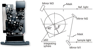 Diffuse and spectral reflection can be measured without using special attachments by combining a 0°/8° incident integrating sphere with the S/R exchange function of the spectrophotometer. Since the size of the flux of the reflection measuring unit can be altered, micro samples of with a minimum flux size of 2 x 3 mm can be measured. The flux size of the transmission measuring unit also can be closed down to about 3 x 3 mm.